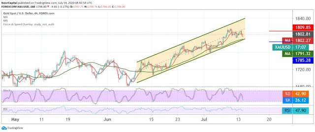 14-7-2020يواجه سعر الذهب ضغط سلبي لحظي ليختبر دعم القناة الفرعية الصاعدة التي تظهر بالصورة، يرافقه اقتراب مؤشر ستوكاستيك من مناطق التشبع في البيع، ونلاحظ أن المتوسط المتحرك 50 يلتقي مع الدعم المذكور ليضيف مزيد من القوة إليه.