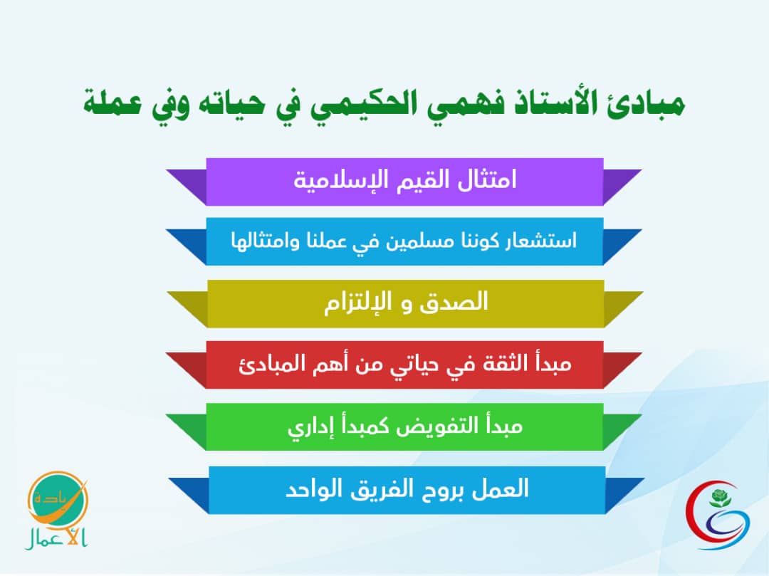 كما يقال بأن لكل رائد أعمال مبادئ وقيم يتحلى بها، سألنا الأستاذ فهمي الحكيمي عن مبادئه في الحياة وفي العمل، فذكر المبادئ التي يرتكز عليها في حياته وفي عمله وهي:1. امتثال القيم الإسلامية 2. استشعار كوننا مسلمين في علمنا وامتثالها 3. الصدق والالتزام 4. مبدأ الثقة في حياتي من أهم المبادئ5. مبدأ التفويض كمبدأ إداري 6. العمل بروح الفريق الواحد ، لأن تكامل الادوار هو الطريق للنجاح والنمو المستمر والتطور.ومما أعجبني هو قوله : لا ندعي الكمال في مبادئنا لكن هاجسنا هو امتثال مبادئ الإسلام في حياتنا![]() |